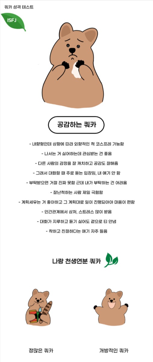 저는 공감하는 쿼카가 나왔네요. ISFJ 성향이라고 해서 놀랐습니다.